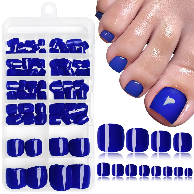 - đź’…Quanlity Toe Glue on Toenails: Blue fake toenails press ons are made of quality ABS formulated to have a natural nail-like appearance. Pre-shaped toenails press on nails have a thin, flexible back edge for a seamless fit and comfortable wear, thick front tips for a strong and lasting wear.Blue toenails fake feet provide full coverage square tips in a short square cut for a clean, filed-down effect. You can DIY salon perfect Blue pedicure at home in few minutes with Blue artificial toe nails.
