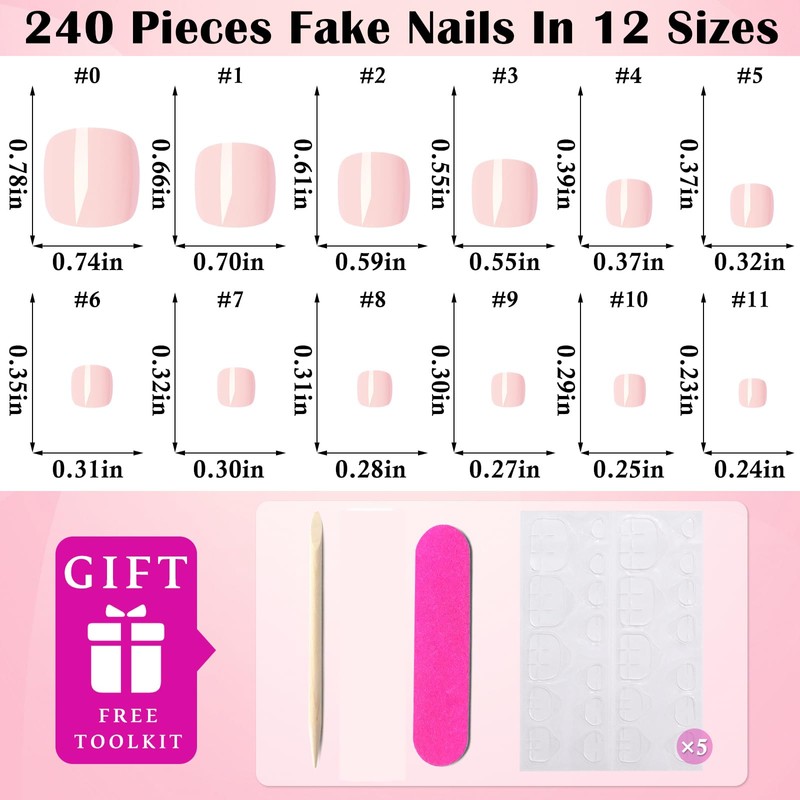 - 💅Pink Press on Toenail Kit: Gel fake toenail kit includes 240pc short square shaped press on toe nails with 5 sheet nail adhesive tabs, 1pc nail files and 1pc nail wooden stick. Toe press on nails with adhesive tabs is a easy at home toenail set for nail salon and nail beginner or lover.Light pink press on nails for toes help you diy stylish feet manicure within few minutes. Light Pink toenails press ons with tabs are friendly to nail starter and nail techs who lover manicure.