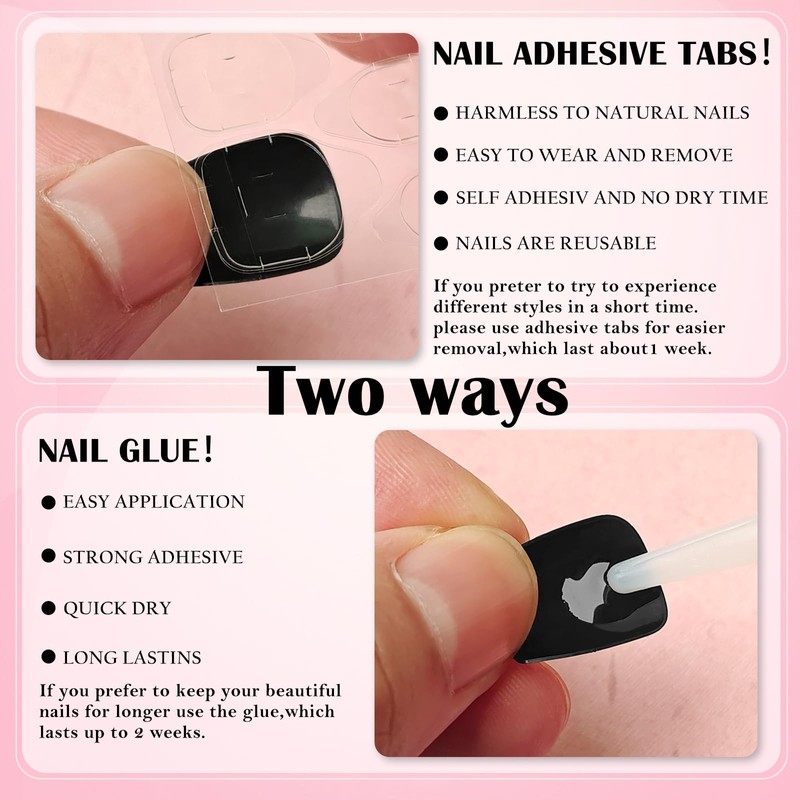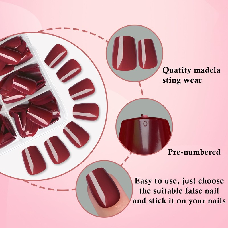 - Short Press on Nails Kit with Glue: Extra short coffin nails press ons fake nails includes 288pc gel press on nails short coffin shape, 5 sheet adhesive nail tabs, 1 tube nail glue, 1pc nail file and 1pc wood nail stick. Short fake nails coffin press ons nails and manicure tools are packed in 12 grids transparent plastic box for easy carry, storage and reach out, Press on nails with glue are ready for manicure anytime, anywhere.