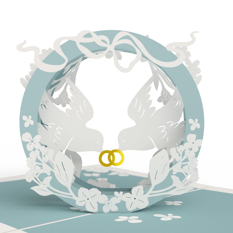 - ELEGANT DOVE WEDDING CARD - This romantic pop up card features two white doves wearing two gold wedding rings in a delicate light blue ring - a beautiful symbol of love, loyalty and the path of life together.
