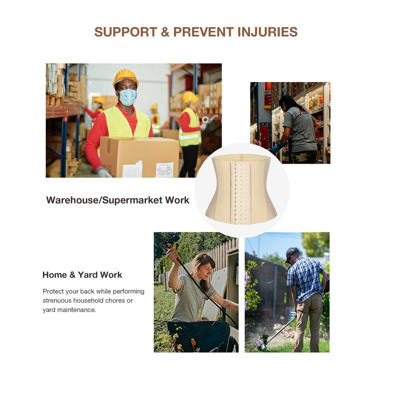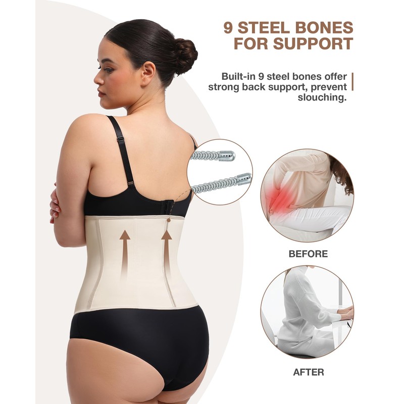 • IMPROVED POSTURE-Elaborate hourglass shape design and 9 steel bones allow this waist trimmer cincher to perfectly fit women's curves for all body shapes, providing amazing back support and helping you to improve your gorgeous figure. The tummy wraps protect your lower back & support your waist to prevent injuries and sprain from exercise. They can also be used for correcting hunchback, or even as postpartum tummy bands to promote a quick postpartum recovery.