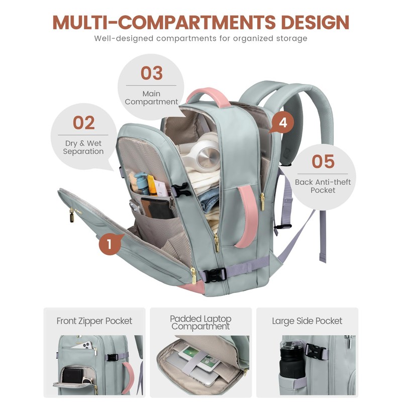 - With 3 Packing Cubes & Wet Pocket : Our travel backpack for women equipped with 2 carry-on cubes, deal for neatly storing underwear, socks, and small clothes. And equipped one shoe bag with 16.5 inches/42cm long, can hold 1~2 pair of shoes. The high-density waterproof wet pocket is perfect for toiletries and damp clothes, keeping your travel belongings tidy and separated.