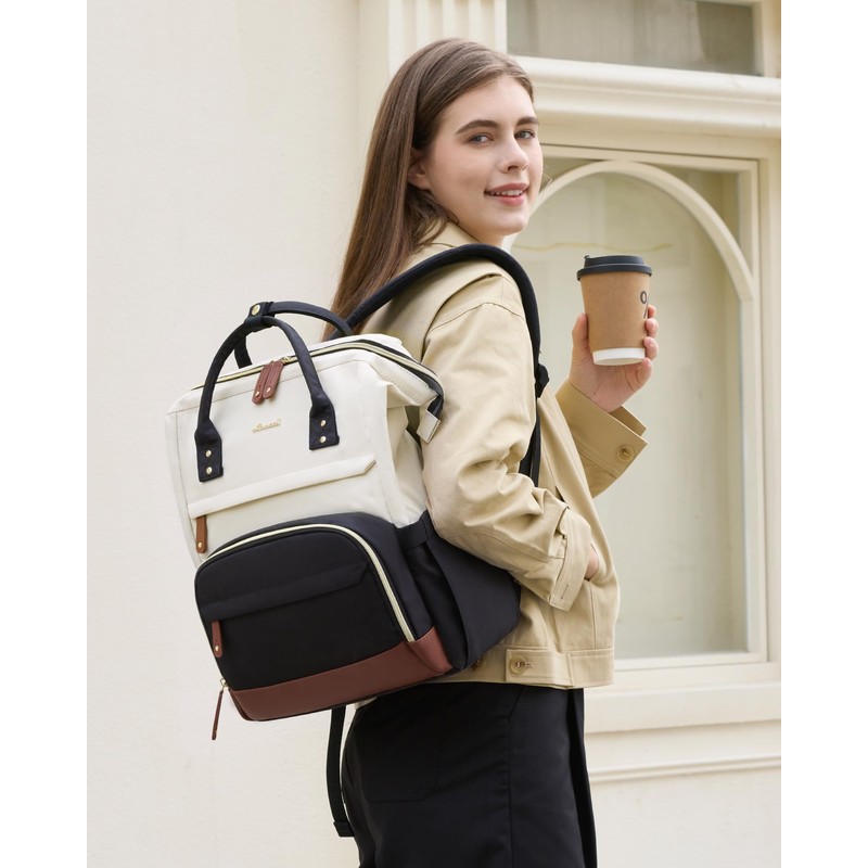 Available in a stylish black-white-brown color combination with elegant gold hardware, this backpack is perfect for work, school, or travel.
