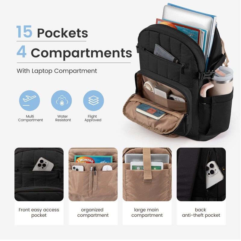 - ✊【Spacious Design Laptop Backpack Women】: The quilted puffer design adds a stylish touch, TRENDY AND MODERN, a chic choice for work, college, or casual outings. Very clean lines, perfect for a professional or casual setting. Total of 4 compartments and 15 pockets for your computer,A4 folder,bottles,30/40oz cups,umbrellas,clothes,work supplies,college supplies and travel essentials.Size: 13”L 19.5”H 8.5”D.