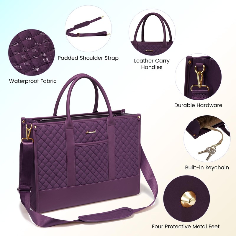 LOVEVOOK Laptop Bags for Women, 15.6 inch Waterproof Work Tote Bag with Clutch, Professional Teacher Computer Purse Lightweight Shoulder Bag Travel, Dark Purple