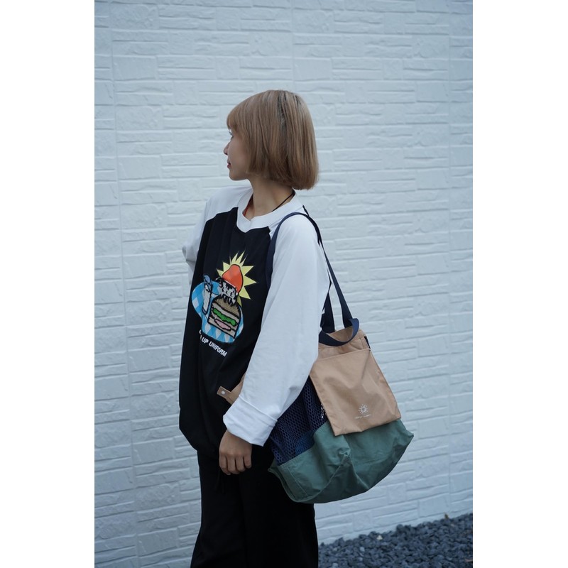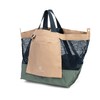 - Material: A carry-all bag with a combination of nylon mesh and structured nylon. Mixed materials and large product label on front