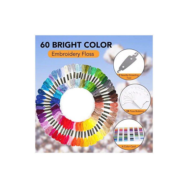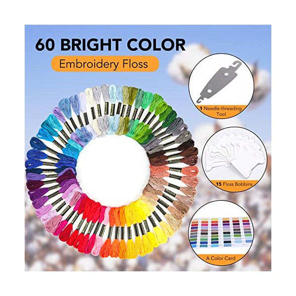 - „ÄêWHAT YOU GET„ÄëEach package contains 60 skeins embroidery string, a color card, a needle threading device, and 15 thread winding boards. Having such high quality embroidery thread kit is the first step to complete your exquisite handicraft.