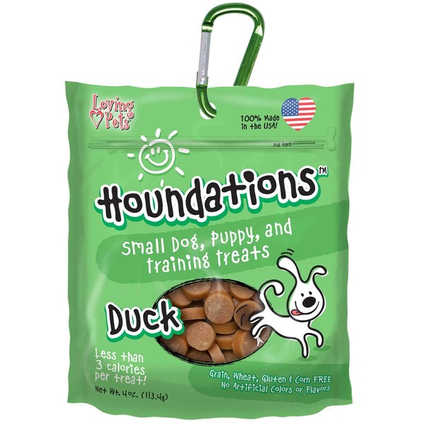 Help build your dog’s healthy, happy foundation with Houndations. From the time you bring your puppy home, through the training sessions and into life with your new best friend, Houndations is there for you. Made in the U.S.A. with meat as the first ingredient you can feel confident offering your puppy or dog Houndations Grain-Free treats. Bite sized with less than 3 calories per treat they are perfect as a training reward. What you offer your dog is just as important as what you don’t give them. Rest assured that Houndations is an All Natural, Grain, Wheat, Gluten and Corn free treat with no artificial colors or flavors. Loving Pets knows that you want to keep Houndations nearby to reward your dog whether at play, on the go or in training sessions so we designed a unique easy open pull tab pouch and included a free carabiner. Simply clip it on and zip it open for a fast bite sized piece of love for your furry friend.