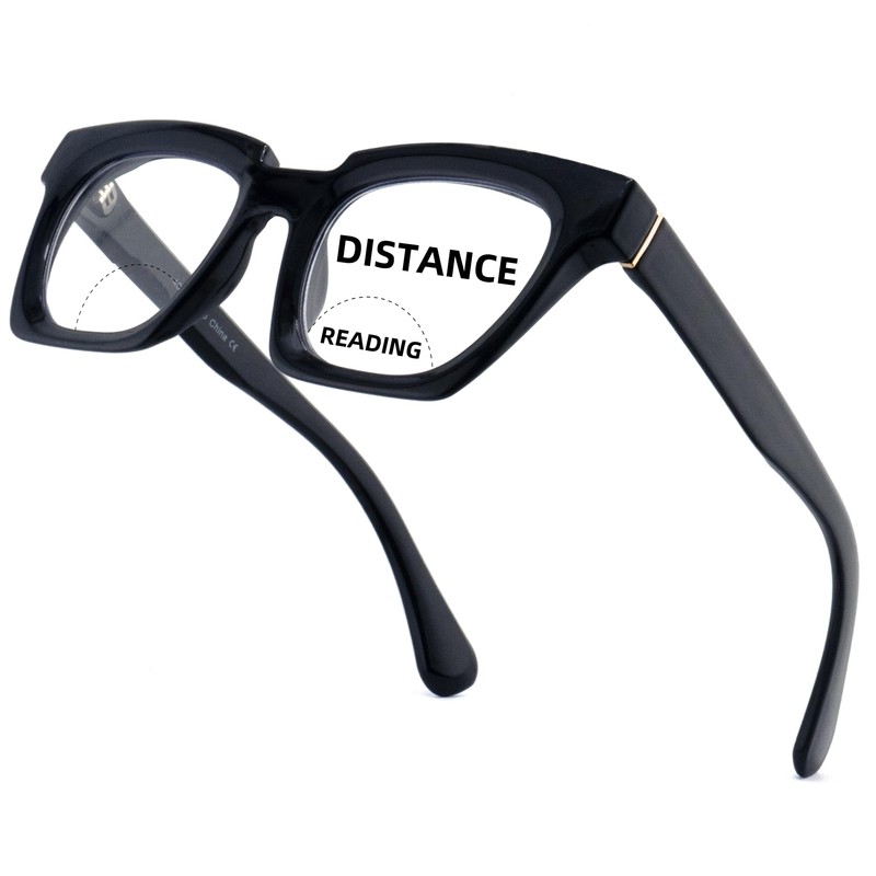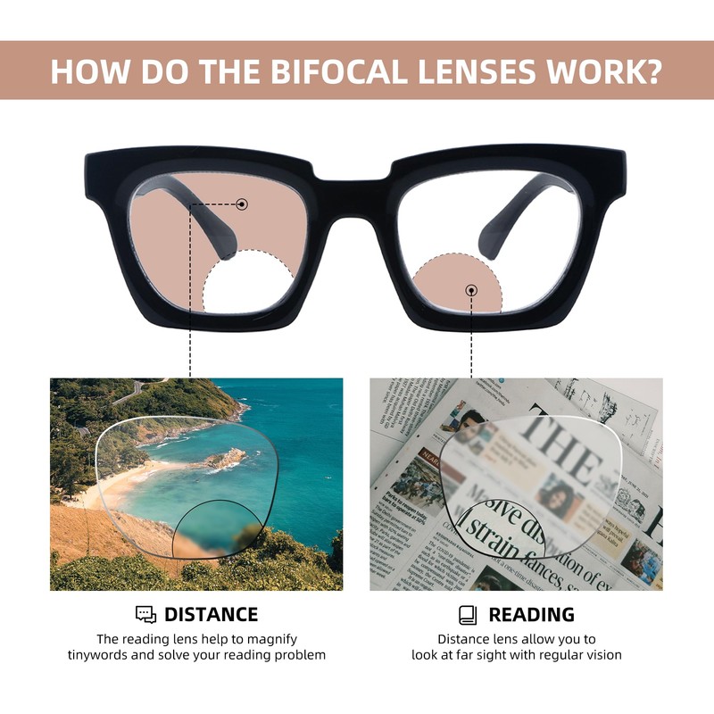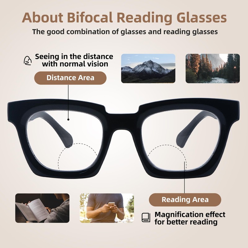 Progressive Bifocal Glasses for All Your Need. The top position of bifocal reading glasses has no degree of prescription helps you see far away things. The lower flat-top magnification are the degrees of presbyopia you have selected helping your eyes focus on reading .You no longer need to carry multiple pairs of glasses. Progressive Bifocal Reading area is smaller than ordinary full magnifying lens! Need 1 week to adapt it for the first time wearing! Please tear off the protection lens films before using!