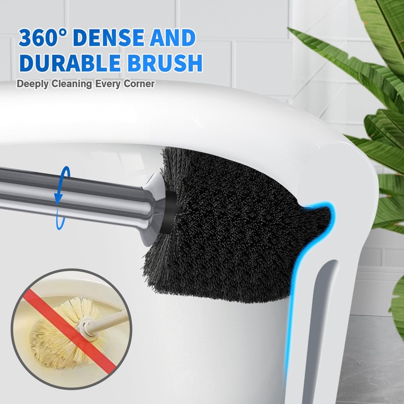 • 🚽【360°DENSE & DURABLE BRUSH】 Strong bristles are not easy to get deformed, they are economical and practical, the dense nylon bristles offers thorough and deep cleaning of under-rim area and those hard-to-reach corners without succumbing to discoloration or staining. At the same time, water easily drips off bristles into steady holder, brings you a refreshing cleaning experience.