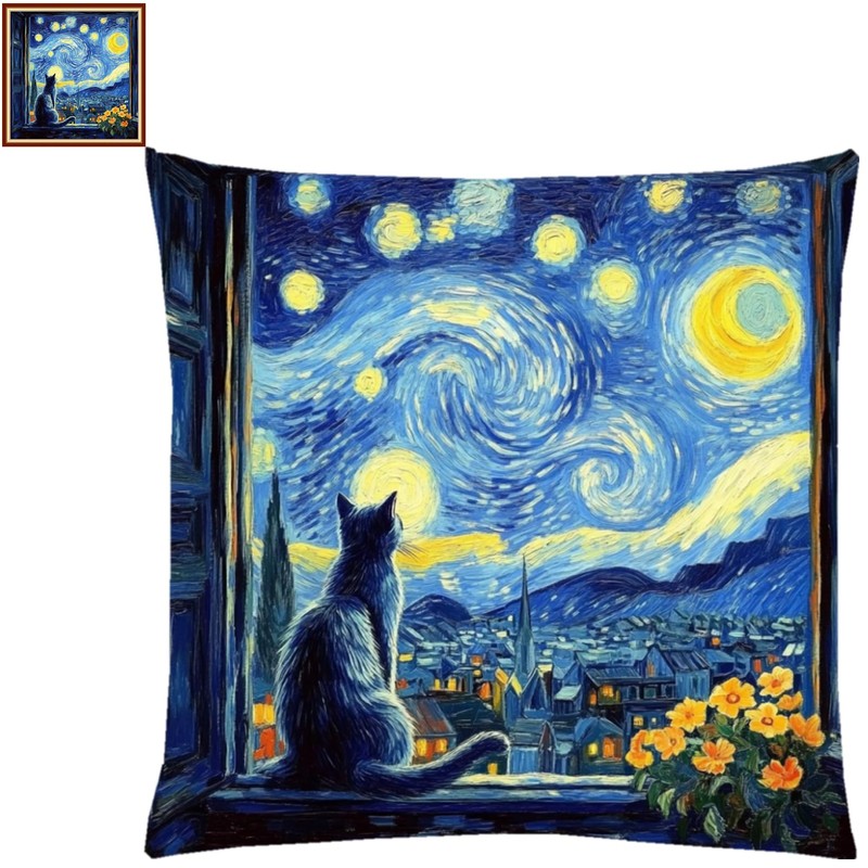 Lovxvouy Pillow Cross Stitch Kits for Adults Beginners-Preprinted Needlepoint Kit Stamped Crossstitching Kits 11CT Cross-Stitch Kit Stitches Kit Embroidery Kits-Cat Van Gogh Starry Sky18x18 inchs