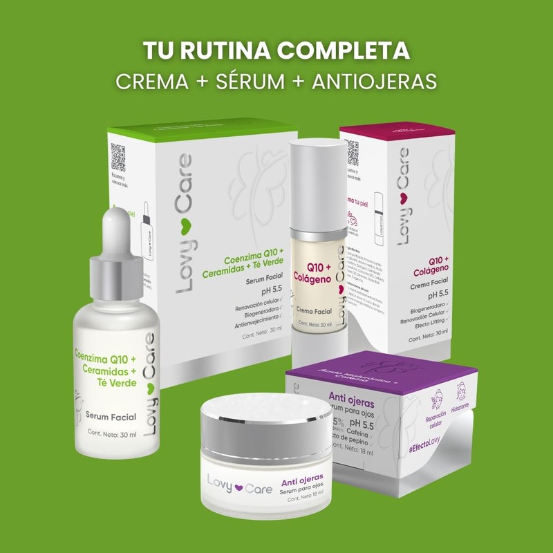 LOVY CARE Kit de Cuidado Facial Completo, 1 Sérum Coenzima Q10, Ceramidas y Té Verde + 1 Crema Hidratante con Colágeno + 1 Sérum Antiojeras con Cafeína y Pepino, Piel Radiante y Rejuvenecida