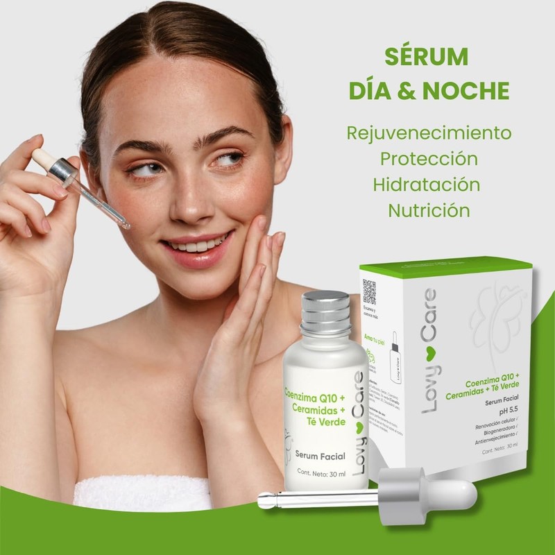- SÉRUM FACIAL CON COENZIMA Q10, CERAMIDAS Y TÉ VERDE: Aporta hidratación y firmeza.