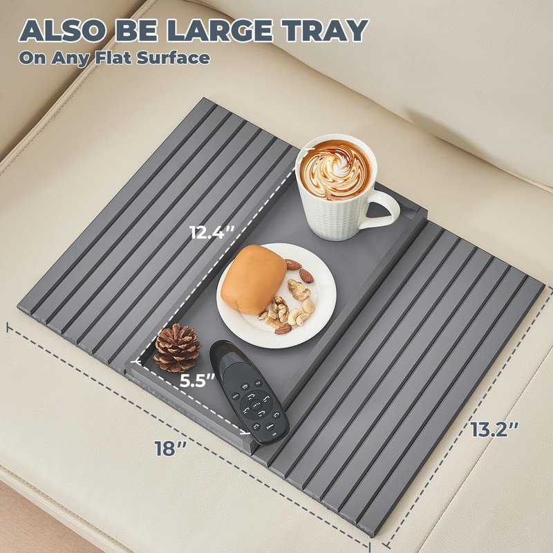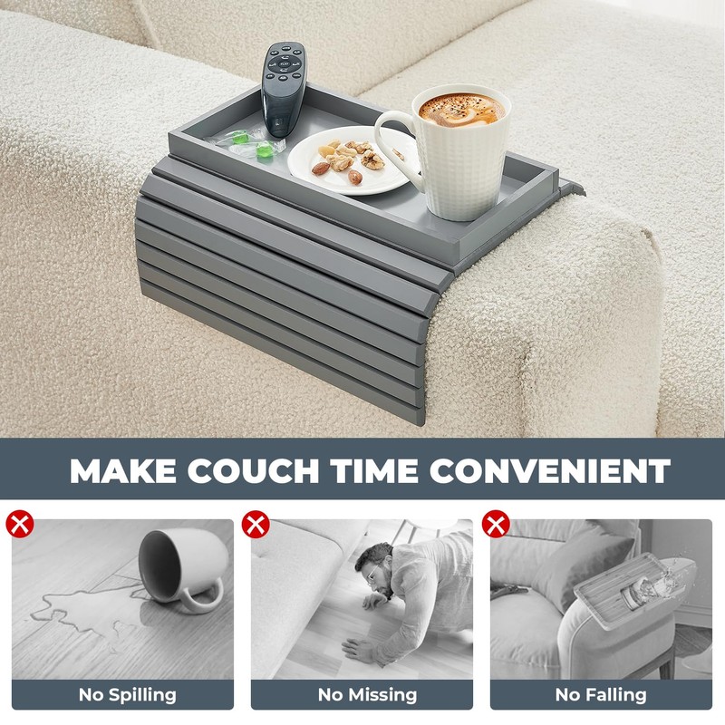- DETAIL DESIGN: The spacious couch arm tray can accommodate more of the items you need, such as beverages, snacks, phone remote control, keys, and more; The design with edges can also effectively prevent drinks from splashing and items from falling; The foldable design is convenient for use and storage.