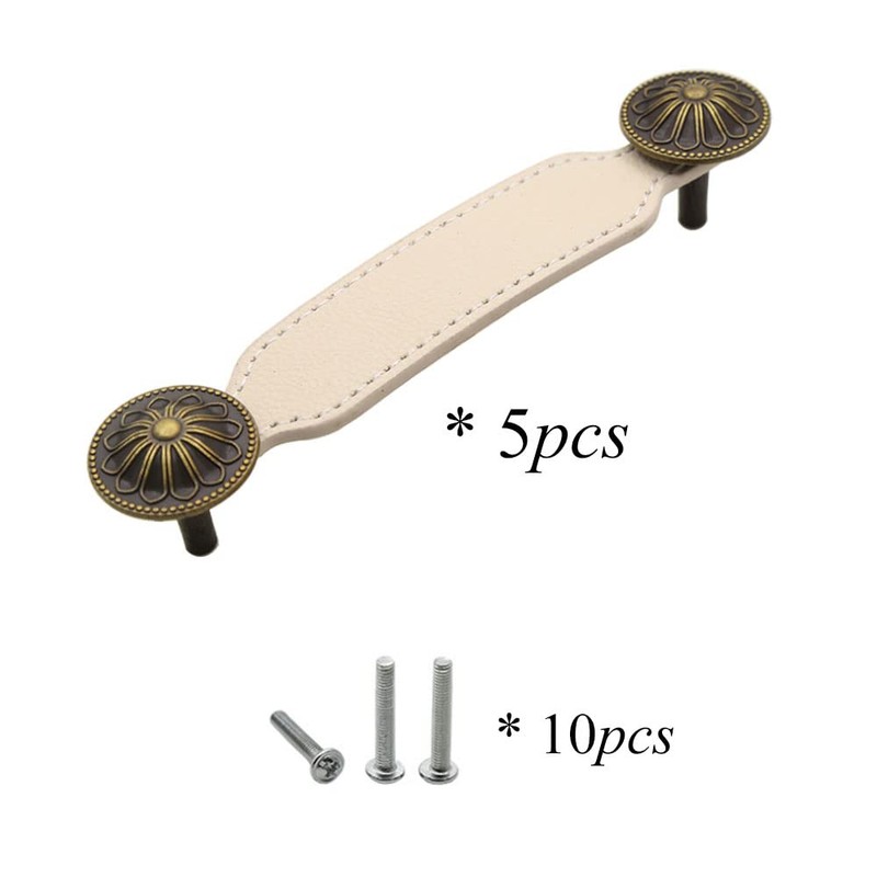- 5 pieces beige leather handles in a set with 10 pieces screw (22 mm), length - 128 mm, width - 31 mm.