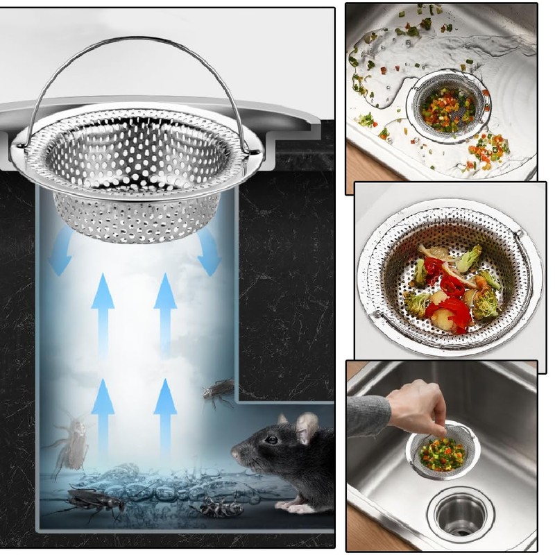 - Design: The sink strainer is designed with a carry handle to avoid the strainer getting stuck in the sink. It can be easily lifted and emptied to make cleaning easier. The built-in design reduces water accumulation and odours and prevents rodents and insects from interfering.