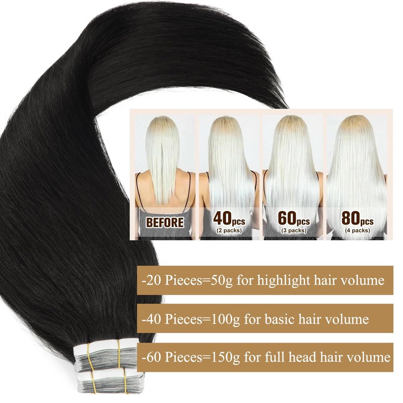 - Weight of tape in extensions: 2.5g per piece, total 50g, 20pcs per package. Normally, one pack is natural for add length or volume. Two packs for full head