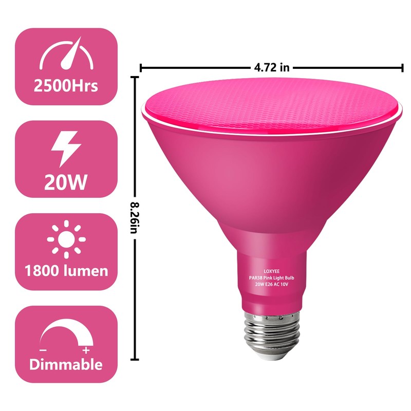 LOXYEE PAR38 Flood Pink Light Bulb,2 Pack-Dimmable,E26 Base Pink Flood Light Outoor(20W Replace to 200W),Pink Light Bulb Outdoor Porch,Colored Light,Spot Light,Halleween,Christmas Lighting