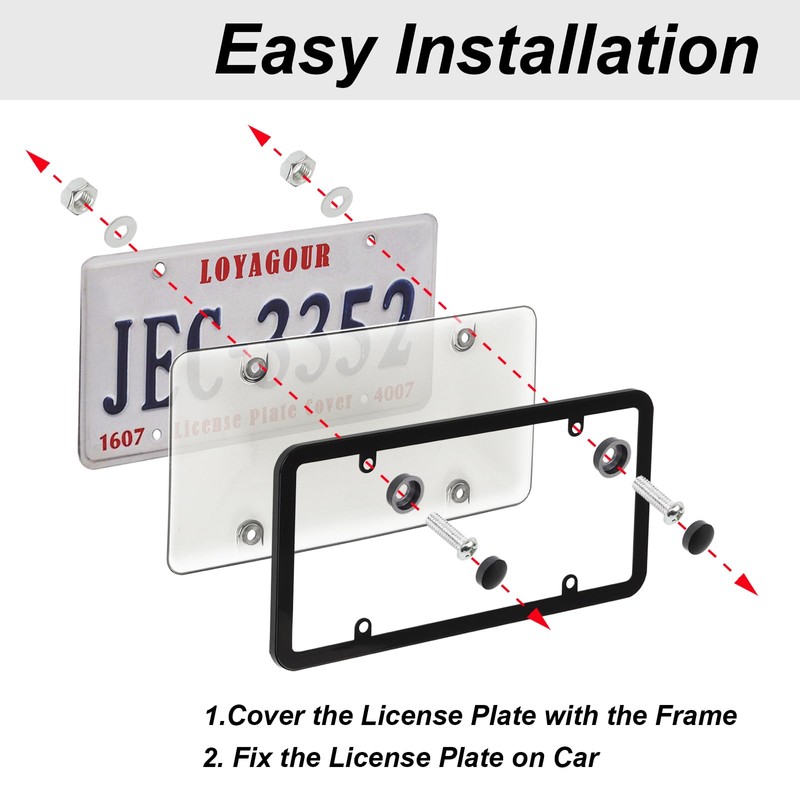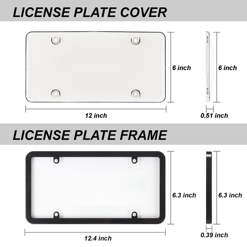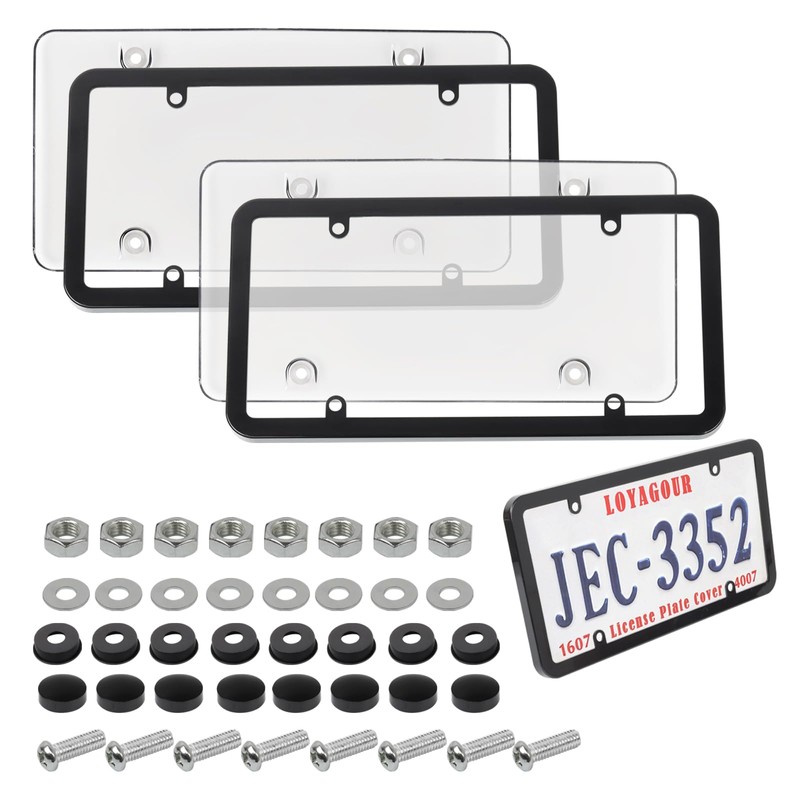 - Packing List: This clear license plate frame cover kit includes 2pcs clear license plate covers, 2pcs black plastic frames and 8pcs screw kits. Each license plate shroud has 4 mounting holes, one in each corner, which aligns perfectly with your license plate holes.