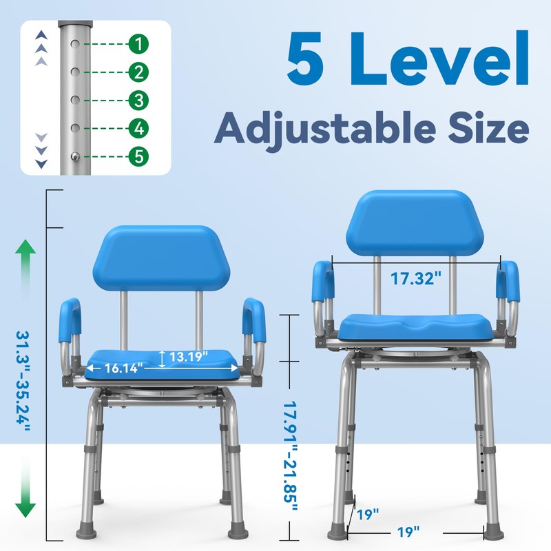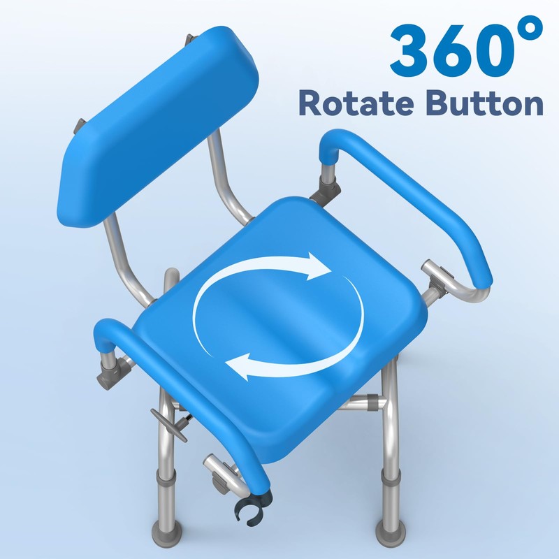 - 360° Pivot with 4-Position Locking: This shower chair pivots smoothly 360° and locks securely at 90° intervals, allowing seniors to adjust their position without standing. Easily access every angle of the shower while reducing the risk of slips and falls