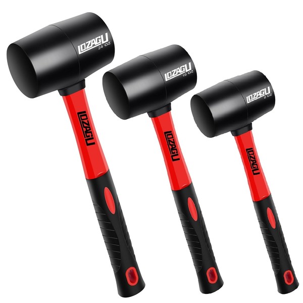 LOZAGU 3-Pack Rubber Mallet Hammer 8oz 16oz and 24oz, Fiberglass Handle, Rubber Mallet for Flooring, Tent Stakes, Woodworking, Camping, Soft Blow Tasks without Damage