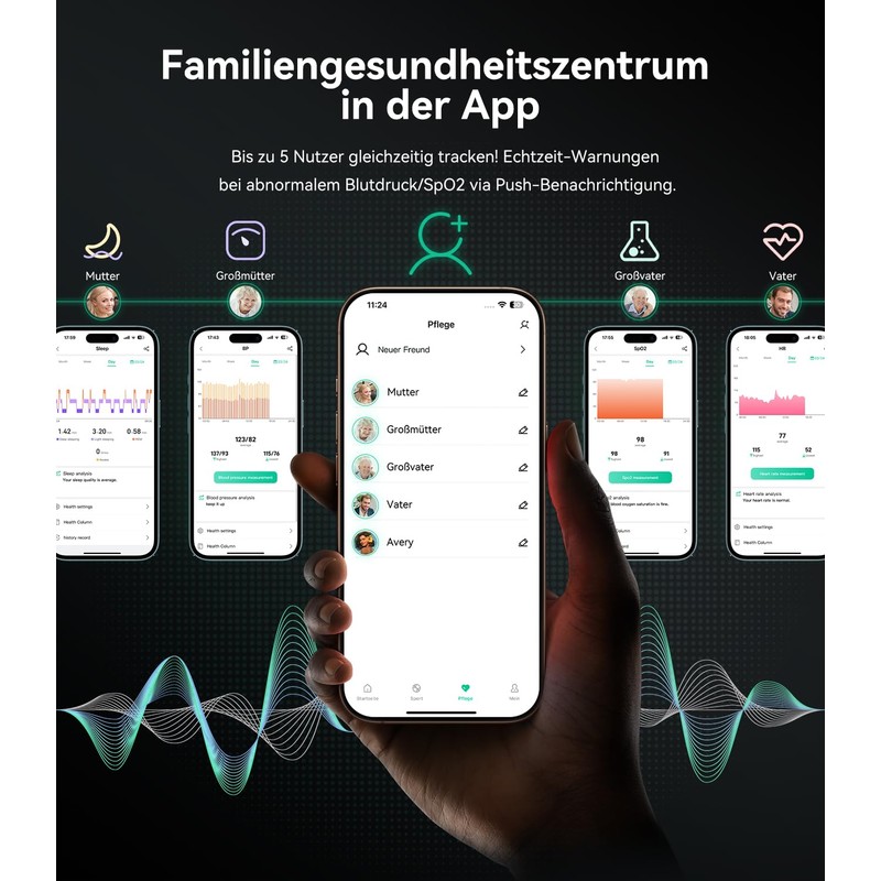 - Family health centre in the app: Track up to 5 users at the same time. Real-time monitoring of blood pressure abnormalities via push notification. Sleep analysis based on WHO reference values. Share fitness goals (steps, calories).