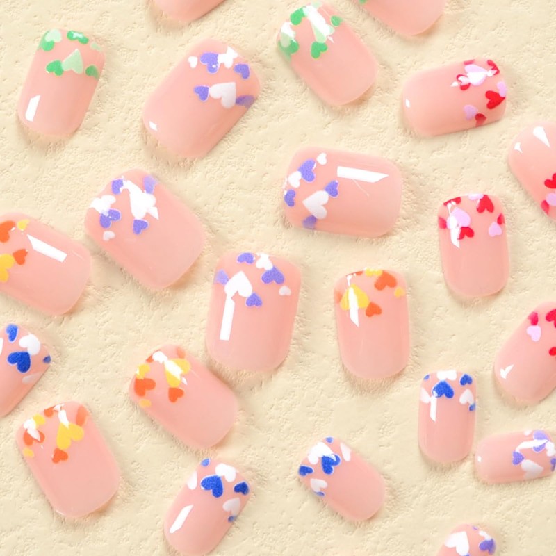- Colorful Heart Fake Nails: The package include 24pcs short press on nails & a nail file & 24pcs jelly glue stickers. (Durability of jelly glue sticker is NOT as good as liquid glue, but it makes fake nails reusable. Please use your suitable glue according to different scenes)