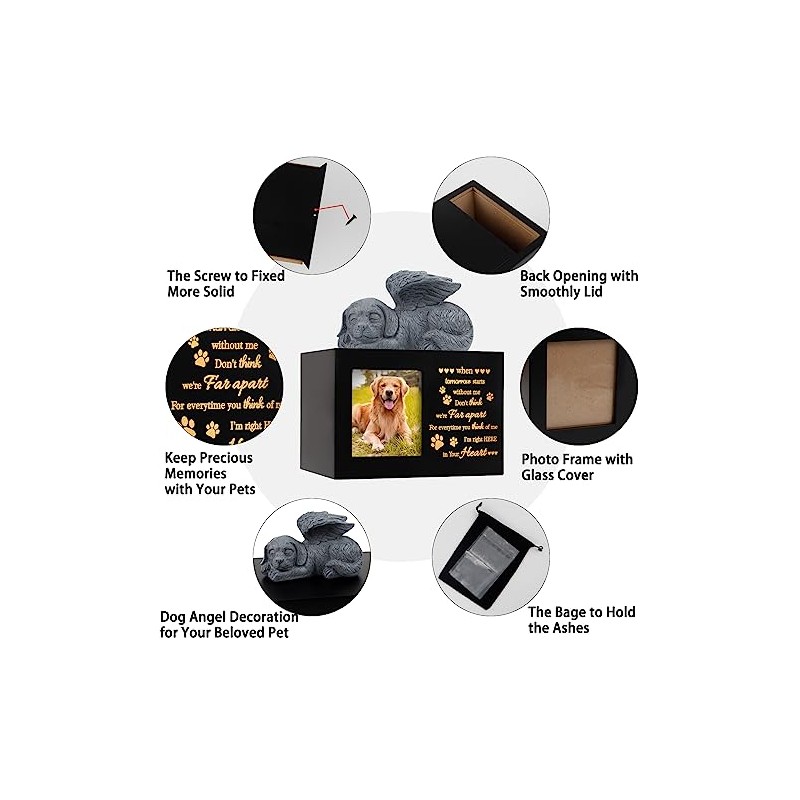 Features:Whether they're greeting you at the door or curling up with you at night, pets are a part of our family.They bring comforting joy to any situation. So, when a pet passes, it's never easy to cope with the loss.While it is understandable that nothing can replace the lost pet, one of the greatest comforts can be to create a dignified and elegant final remembrance in their memory.This souvenir pet ashes keepsake can be used as a urn, always cherish your pet's memory and your special bond together.This keepsake boxes dog ashes for dogs can also be used to store some of your favorite souvenirs from your best friends. Although your fur baby is gone, their memories will always be in this dog urns for ashes.Specification:Type: Pet UrnsColor: BlackMaterial: WoodSize: 7.0 x 4.9 x 5.0 inches / 18 x 12.5 x 12.8cmPackage Includes:1 x Pet urn1 x Dog AngelNotes:1.Manual measuring, please allow 0.5-1cm error.2.If you buy your pet urn and there is a quality problem, we offer a refund service, we will resolve within 24 hours