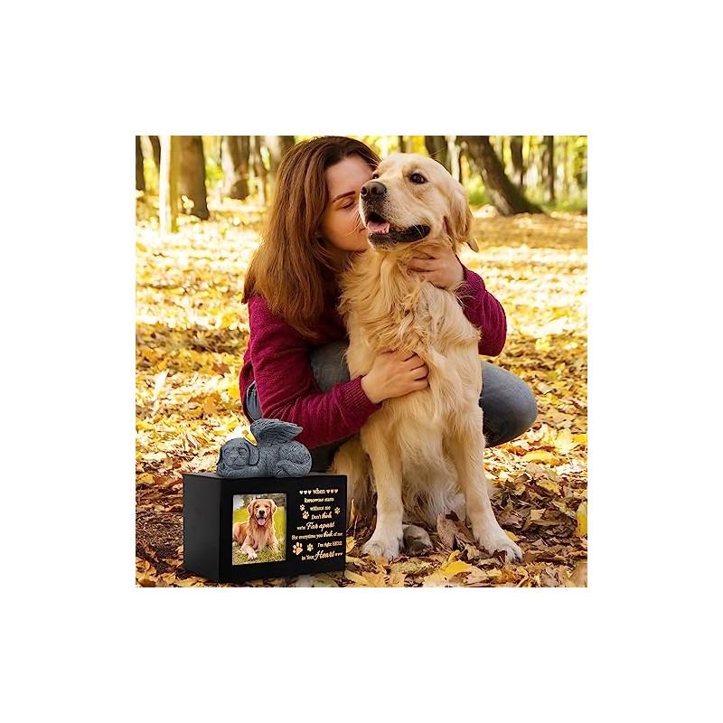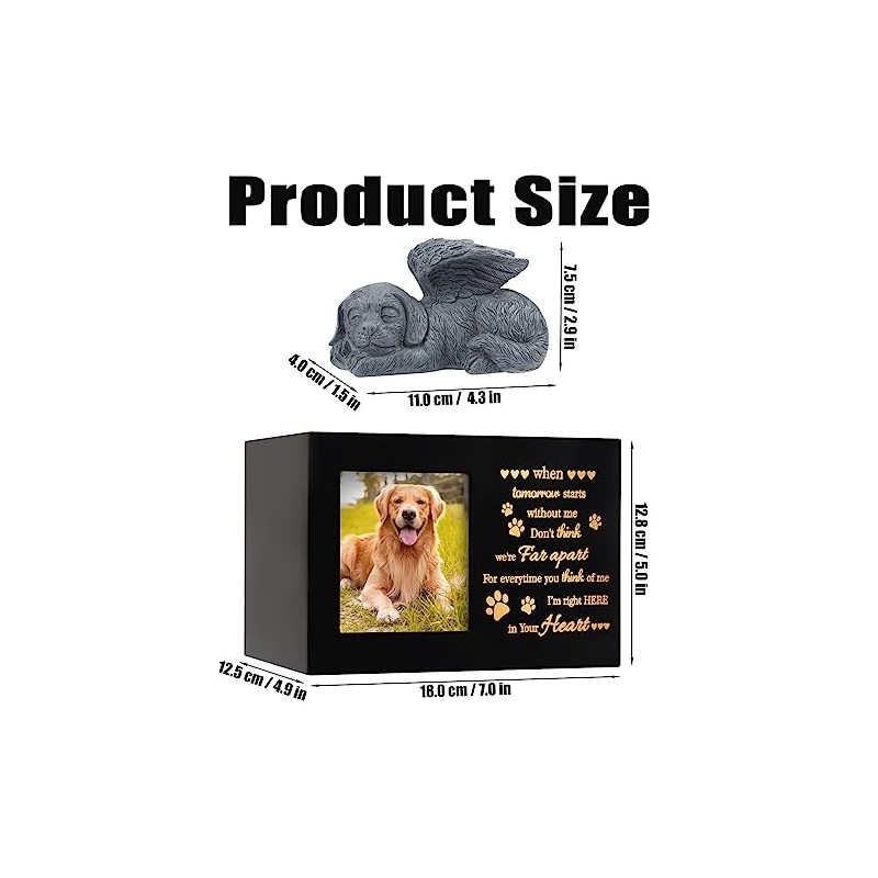 - 【Pet Urn Size】: The dog urn size is 18*12.5*12.8 cm (7.08*4.92*5.04 inches) Inner Capacity 90 Cubic Inches is enough to put the ashes of a medium-sized dog, the size of the dog angel: 12*7.5 cm. The pet frame size: 3.3*2.9 in/8.5*7.5 cm.