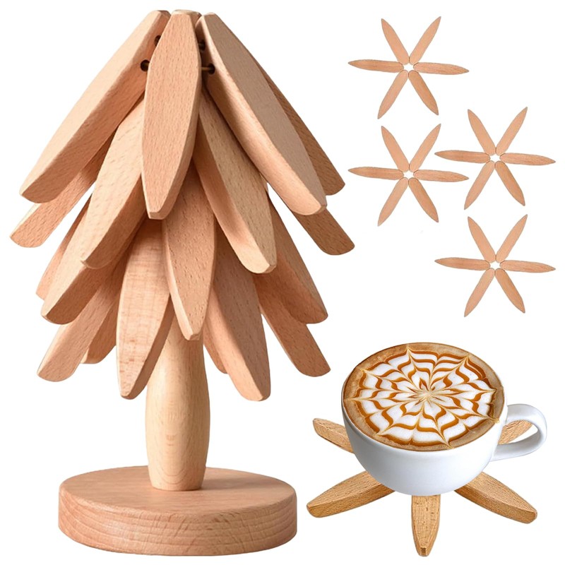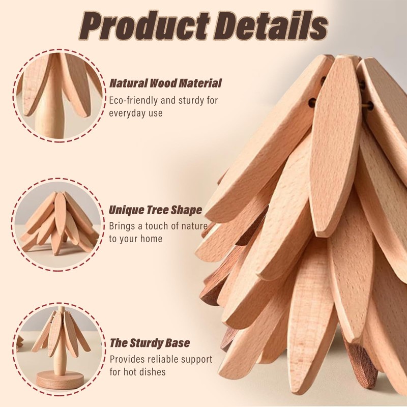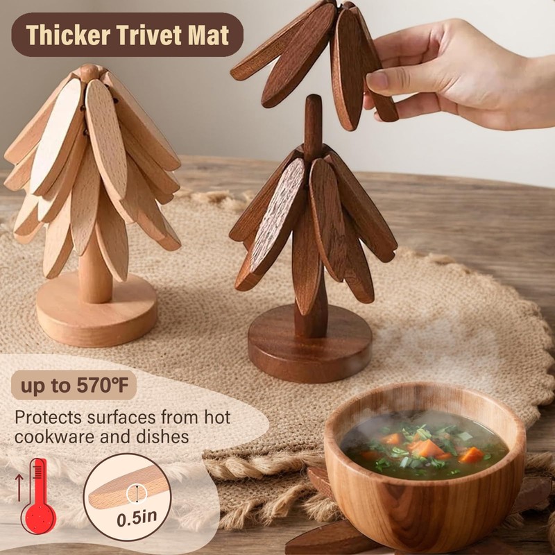 - 【4-Piece Foldable Design】Includes 4 individual wooden trivets and a convenient storage base; each trivet tree unfolds up to 7.8 inches. Easy to assemble and fold, saving space and fitting perfectly in any kitchen setting