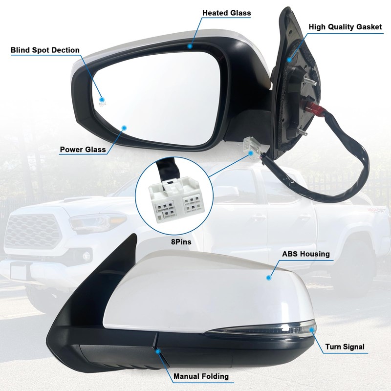 Lqito Left Driver side Mirror Fits 2016-2022 Toyota Tacoma With Power Glass, Heated, Turn Signal, Blind Spot Detection and Manual Folding Match to White Paint Replace TO1321350 (8Pins)