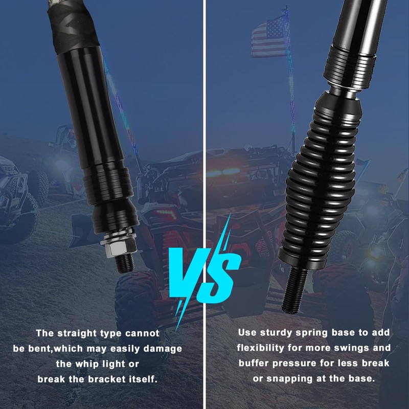 - 【 Sturdy & Waterproof】: It is sturdy and waterproof, and will not break even with significant bending.One year warranty with free replacement. The LED whip is wrapped in high-toughness EVA transparent heat-shrinkable tubes, so you don't need to worry about it being damaged by sand, dust, or rain