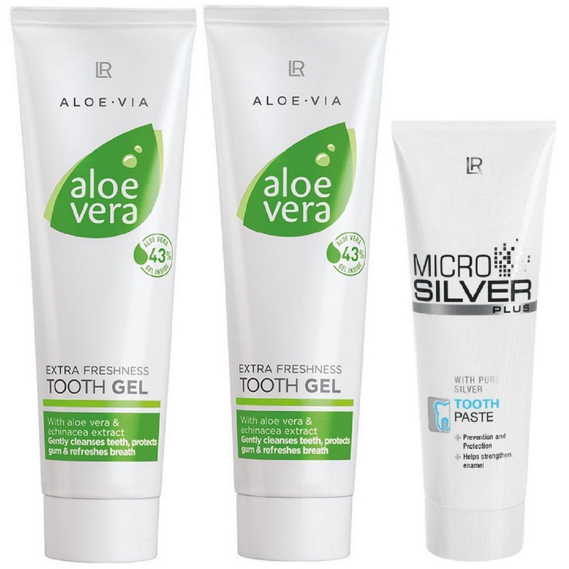 • Set contains: 2 x 100 ml LR Aloe Via Aloe Vera tooth gel extra freshness and 1 x 75 ml LR Microsilver Plus toothpaste