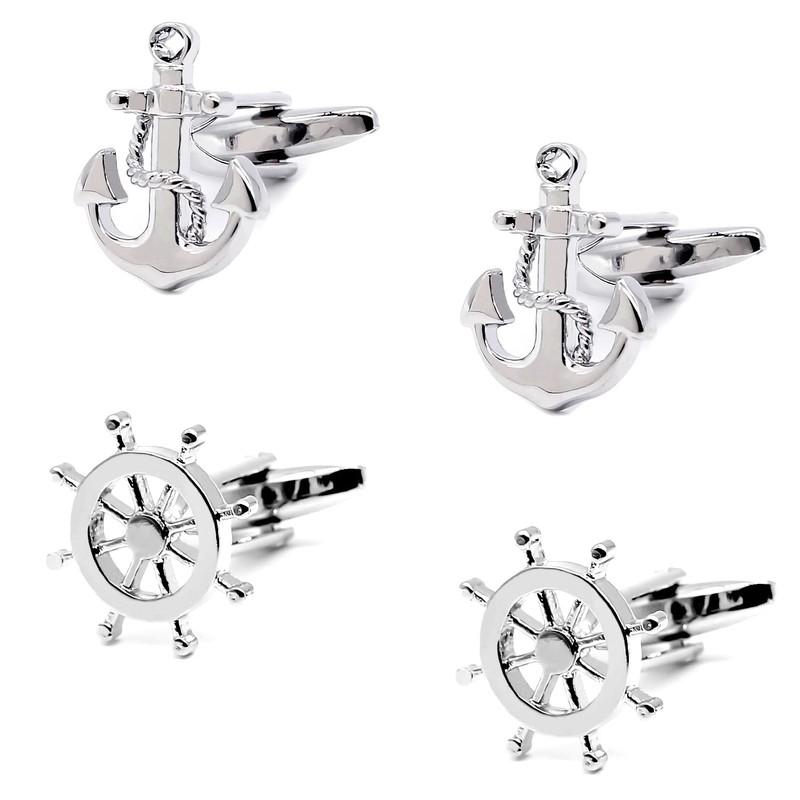 LROEZR Cufflinks for Men Ship Wheel and Nautical Anchor Stainless Steel Shirt Accessories Unique Wedding Business Cuff Links for Mens Jewelry with Gift Box, 2 Pairs