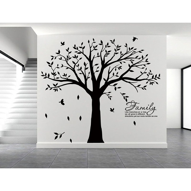 Wall Decal Family Tree Wall Decal Sticker Family Photo Tree Family Like Branches on a Tree Vinyl Wall Sticker Photo Tree Decal Tree Family A beautiful professionally designed vinyl wall tree with branches, leaves and birds that includes the Family wall quote "Family Like the branches on a tree we all grow in different directions yet our roots remain as one." What better way to display photos of your loved ones than in our Family Tree Decal! Place framed photos all around the tree! (photos, frames and memories not included!) \------------------------------------------------------------------------------------------------------------------ **The tree is apporx. 83 1/2" wide by 83 1/2" tall (210cm wide by 210cm tall)** **[ WHAT'S IN THIS SET ]** Large Tree Decal Installation & removal instruction **[ CHOOSE ANY 1 COLOR of Black Brwon White ]** Please Note: A newly painted surface is not recommend to use wall sticker until it is complete dry after 8 weeks. The images on the picture is for illustration purpose only, please refer to the actual size sheet. The actual color may vary slightly due to individual monitor setting. HOW TO APPLY : 1\. FLATTEN IT FIRST,VERY VERY IMPORTANT. (IT IS BETTER TO TAKE 2 OR 3 DAYS). Wipe your wall, make sure it is dust free, oil free, smooth and dry before you apply it onto it. 2\. Cut the sticker into smaller units/Parts if necessary, just for easily apply the smaller unit/part to the wall. Always plan before you apply it on the wall. 3\. Slowly peel the sticker and apply to the surface 4. Use Credit card (or other card) to scrape over the applied sticker only to remove any bubbles. 5\. The best way to apply it is that two people work together.