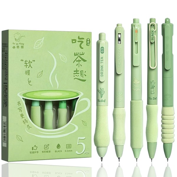 LSLSHY Cute Gel Pens 5Pcs Retractable Quick Dry Ink Pens 0.5mm Fine Point Black Ink Kawaii Smooth Writing Pens for School Office Supplies Aesthetic pretty pens (Green tea)