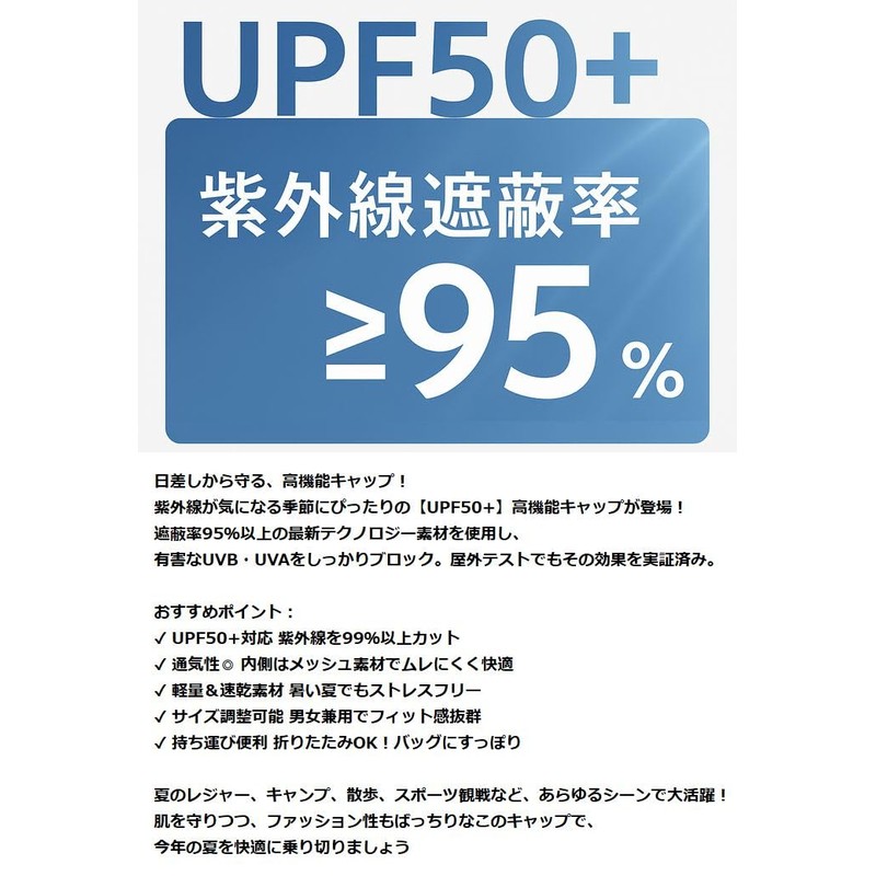 - 日差しから守る、高機能キャップ! 紫外線が気になる季節にぴったりの【UPF50+】高機能キャップが登場! 遮蔽率95%以上の最新テクノロジー素材を使用し、有害なUVB・UVAをしっかりブロック。屋外テストでもその効果を実証済み。