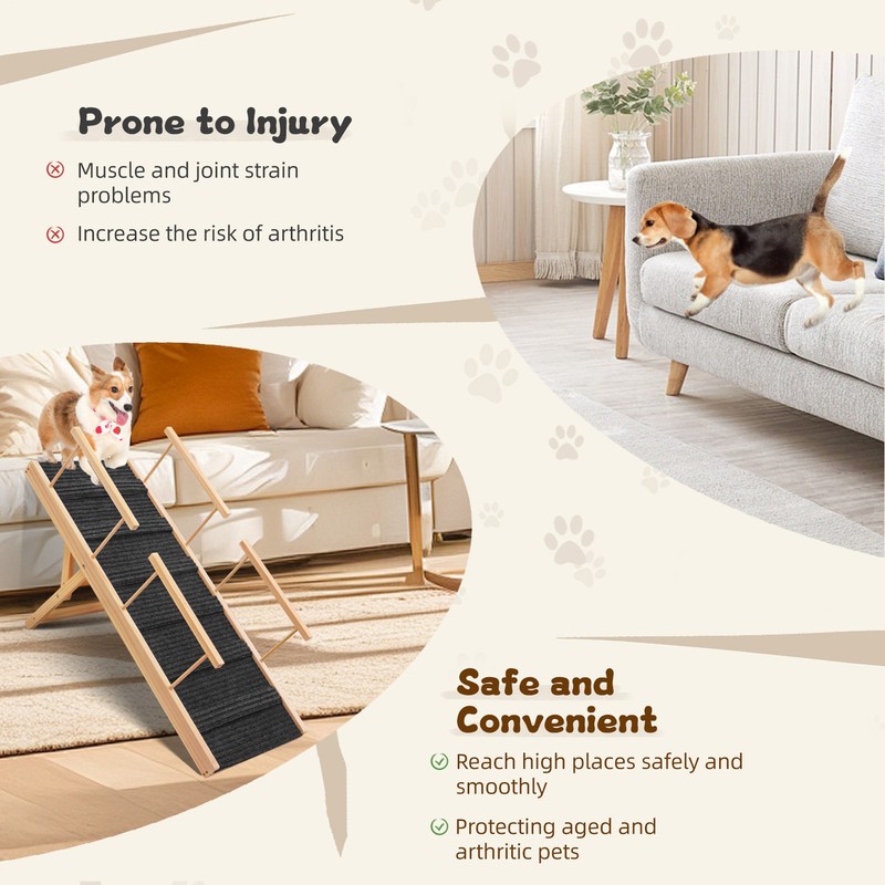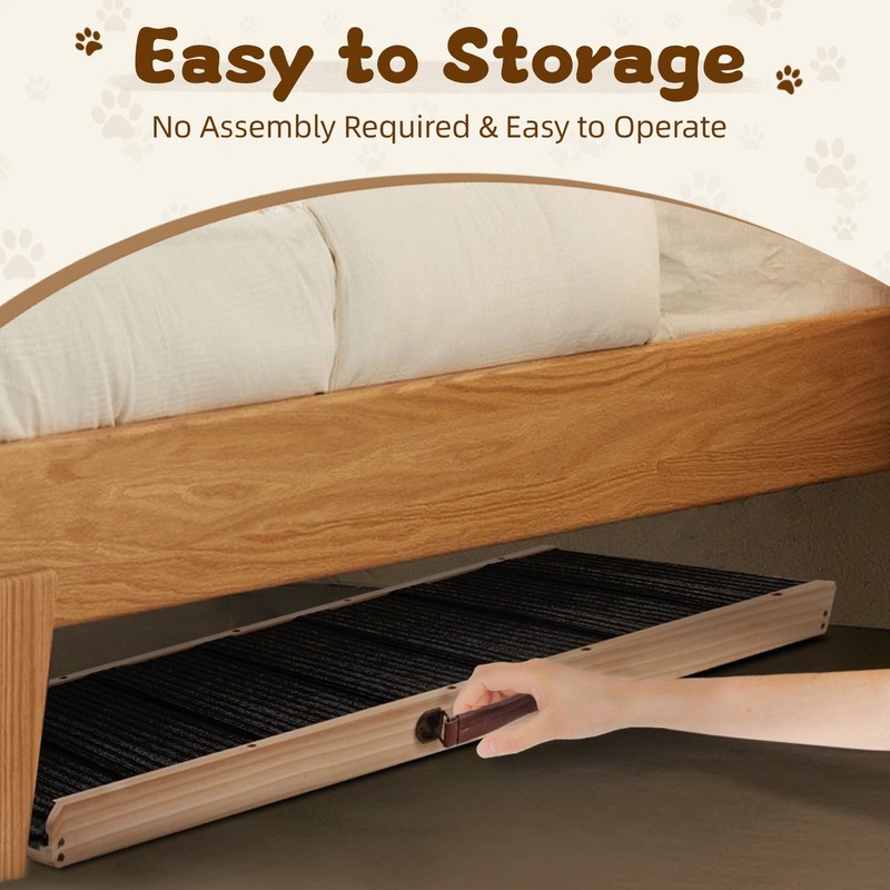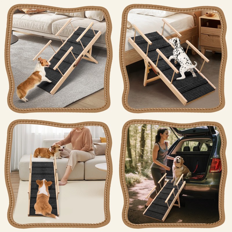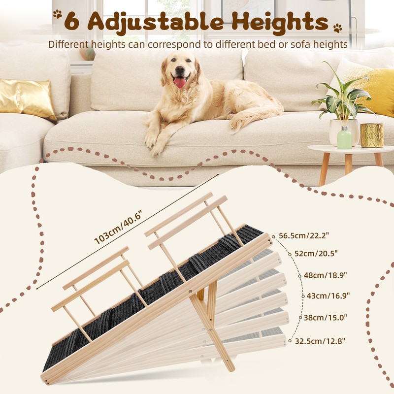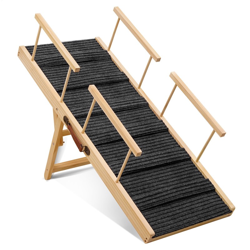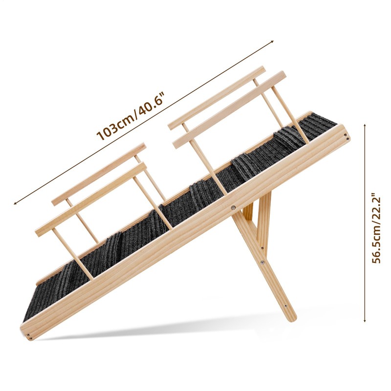 Sturdy and Durable One-Piece Design - Unlike folding ramps, this one-piece design has no cutouts and offers a higher load-bearing capacity. The durable, stable solid wood construction and extra-long wooden slats provide strong support, preventing wobbling or wiggling. Ideal Height - The dog ladder's height is suitable for most situations, allowing you to use it wherever you need it, adding more fun for your pet. Upgraded Anti-Slip Ramp - The black, high-traction carpeted surface (especially useful for older, blind pets, making it easier to see) provides high surface friction. The carpeted and ribbed walking surface provides traction and a stable foothold, allowing you to climb with confidence. Relieve Joint Pain - Using the car dog ramp allows your pet to easily reach the sofa, bed, or RV, avoiding muscle and joint strain caused by jumping, allowing you and your pet to enjoy playtime. The natural color design easily blends into any home style, or you can add a bath mat to the ramp for your pet's extra grip. Excellent Service - The puppy stairs are ready to use right out of the box, with no assembly required. Easy to use and set up. If your pet isn't sure how to use these pet stair steps, try placing treats on the steps to build their trust until they get used to them. Product Attributes: Material: Pine + Multilayer Board + Polyester Dimensions: 79.5 x 47 x 70.5 (assembled) Includes: Guardrail Dog Ladder *1 Guardrail Sticks *8 Guardrail Handrails *4