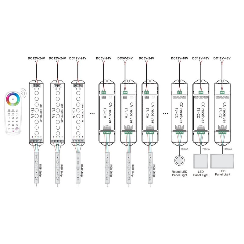 - NOTE:T3 RGB Remote is ONLY suitable for T3-CV (ASIN: B01EJ0RWCK), T3-CC (ASIN: B01EIYSFC8) and T3-5A(ASIN:B01EEZD1WK).If you want to control RGB led strip, you need purchase T3-CV or T3-5A receriver separately. If you want to control led panel light, you need purchase T3-CC receriver separately.