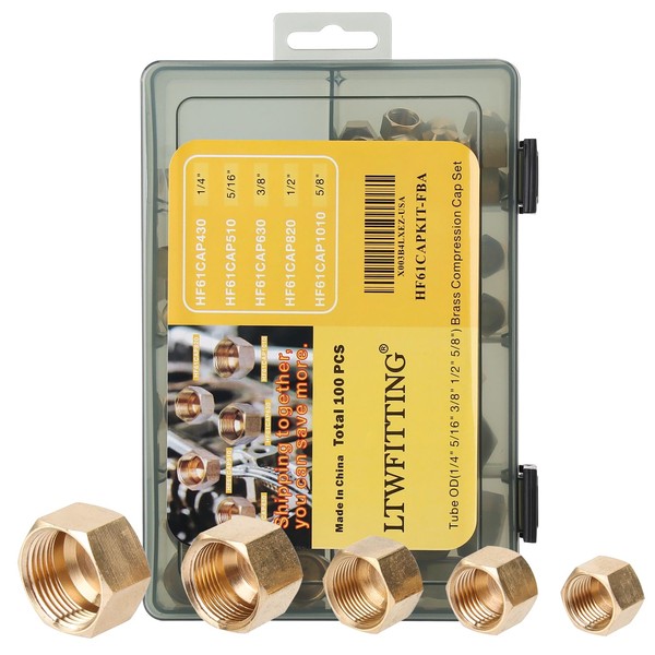 LTWFITTING Assortment Kit Tube OD 1/4" 5/16" 3/8" 1/2" 5/8" Brass Compression Cap Set (Pack of 100)