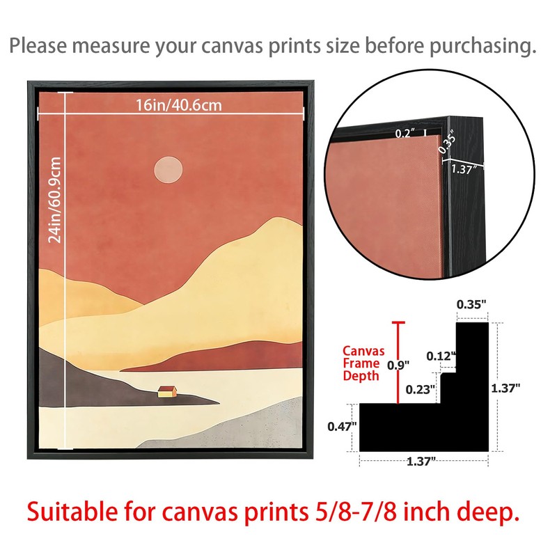 - 💎【Floating Frame for 16x24” Canvas】: Floating Frame suitable for 16x24 inch canvas painting with 5/8-7/8 inch depth. Highlight your gallery wrapped canvas artwork with these elegant floater frames.