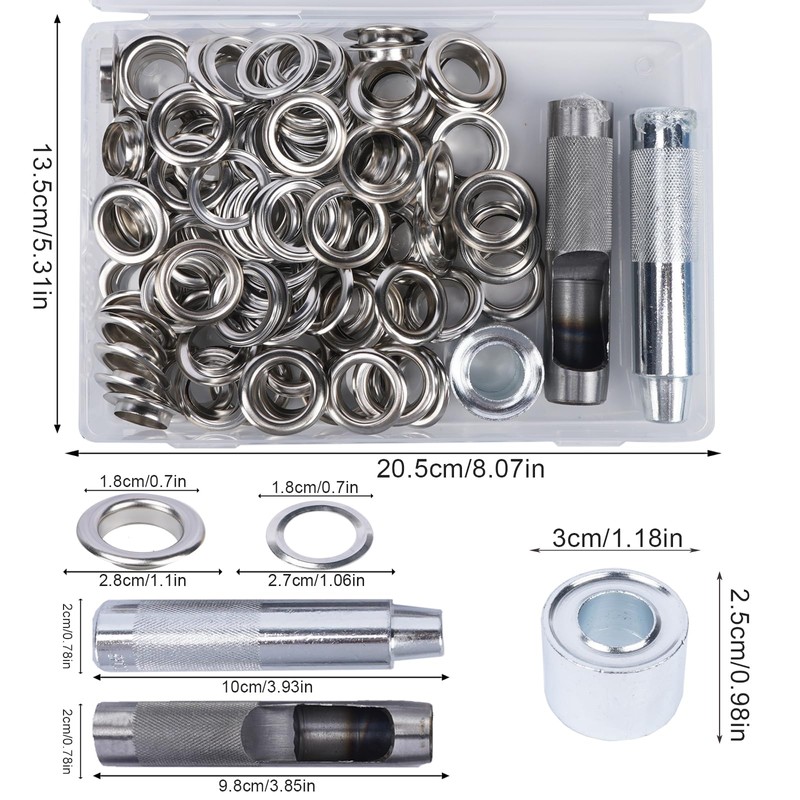 - Complete Kit: Includes 100 sets (200 PCS) with punch tool of 18MM inner diameter brass eyelets, silver eyelet punches, mallet, base, and plastic case. Sufficient quantity to meet the daily needs, the best applicable fabric is not more than 15MM