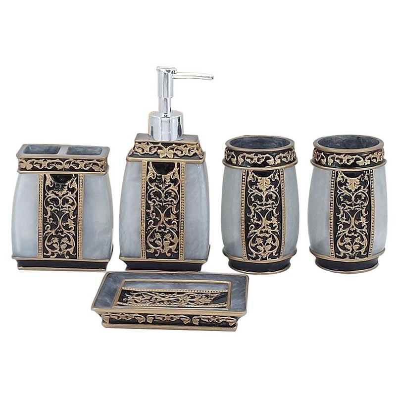 - Contemporary deluxe ceramic 5 piece bathroom accessory set includes 1 round soap dish, 1 lotion/soap pump dispenser, 1 toothbrush holder , and 2 tumbler.