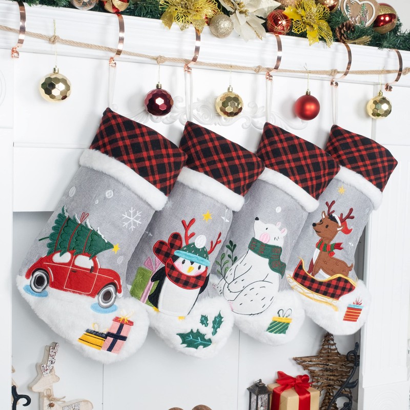 LUBOT Set of 4 Christmas Stockings (20inch) Embroidered Linen Applique Gray Burlap Buffalo Red Plaid with Soft Faux Fur Fireplace Hanging for Family Decorations