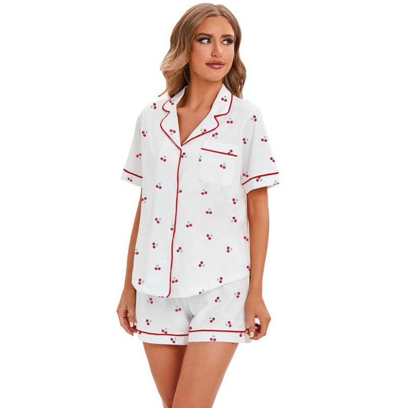 LUBOT Women's Short Pyjamas 100% Cotton Sleepwear Pyjamas Set with Collar Buttons, Soft Lightweight Two Piece Pijamas Pjs Leisure Suit Loungewear, cherry, XL