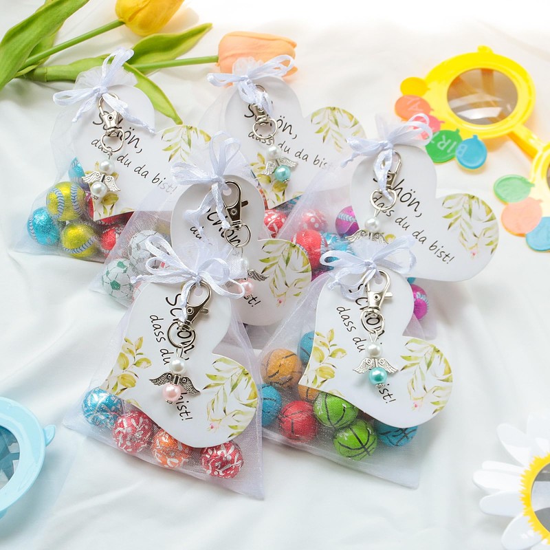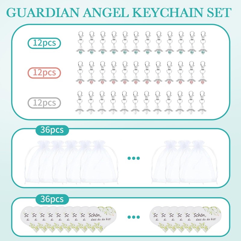 - Guest gift angel pendant set: You will receive 36 guardian angel pendants in three colours, 12 pieces of each colour, 36 heart-shaped paper tags and 36 transparent organza bags. The elegant guardian angel keyring set is wonderful as a gift decoration for any occasion. You can put some sweets, chocolates and other gifts in the gauze bag to prepare a beautiful gift set for your friends, family or guests.