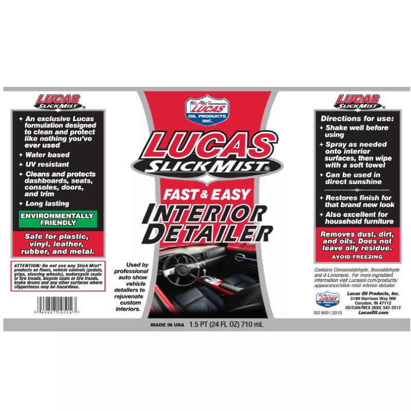 Lucas Slick Mist Interior Detailer is a spray treatment exclusively formulated by Lucas Oil Products designed to clean and protect like nothing you've ever used. Spray as needed onto interior surfaces such as plastic, vinyl, leather, rubber and metal for a "like-new" look. Cleans and protects, dashboards, consoles, doors and trim. Also works great on household furniture.