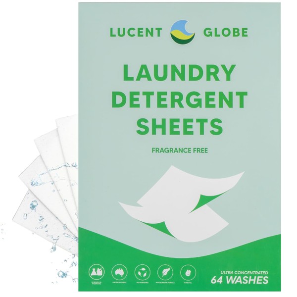 Lucent Globe Sensitive Fragrance Free Laundry Detergent Sheets, 64 Washes, Plant-Based, Biodegradable, Plastic Free Packaging 64 Count