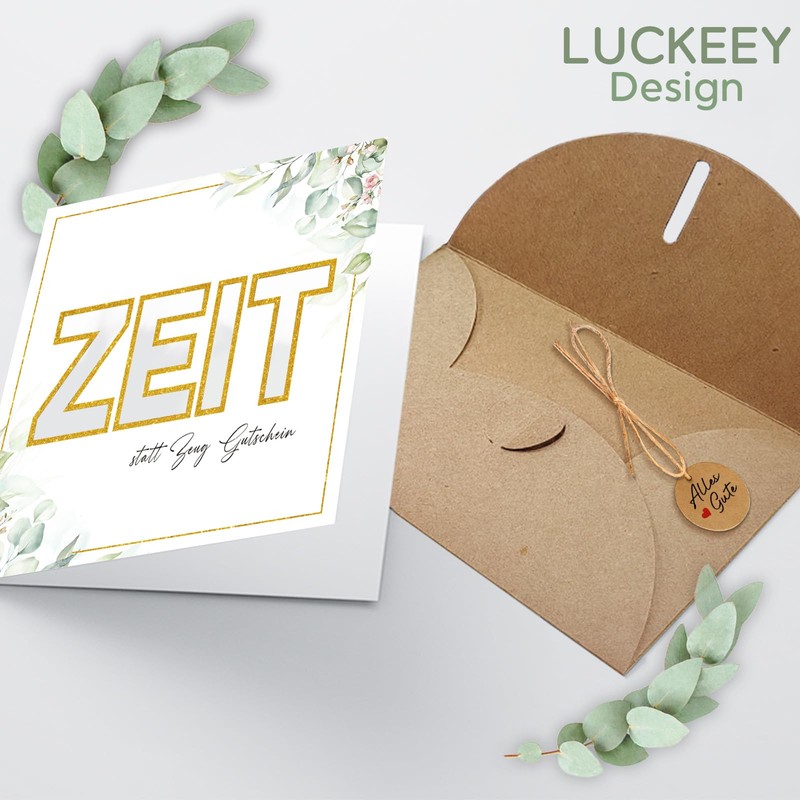 - Time instead of stuff voucher money gift packaging: 1 x eucalyptus leaves ZETT hollow folding card, 10 x transparent stickers, 1 x envelope, 1 x label "Alles Gute ", 1 x hemp rope.
