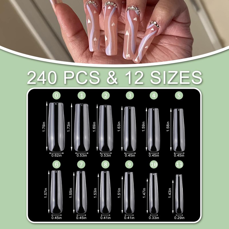 600pcs xl square nail tips are full cover gel x nails, perfect for acrylic nails, dip powder, professional salon and home DIY manicure, nail extension, press on nails makingFake Nails Type: 2.1cm Gel x tips/soft gel nail tipsFalse nail shape: squarenail tipsGlue on Nails Size: 12 Sizes long square shape fake nails clearPress on Nails Coverage: Full cover nail tipsNails Perss ons Color: Clear nail tipsArtificial Nails Material: gel x acrylic nail tipsPress on nails clear square gel nail tips are trackless after foldingSquare gel x nail tips with pre-filed inside to increase adhesionSoft gel nail tips square artificial fingernails are strong, flexible.Gel x nail tips xl square fake nails are comfortable to wear, with thickened front edge and thin back edge.Clear nail tips square long nails have 12 sizes for wide/small nail beds.Clear gel nail tips square fake nails are easy to apply and can be used with any nail polish or gel color of your choice.Square gel x tips are long-lasting,.Square tips gel x nails are easy to file down and is durable (used a nail drill/filer).Long nail tips xl square gel nails are perfect for brittle nails, week nails and short nailsGel x square nail tips provide a strong base for your nails, allowing you to grow your nails longer and stronger Say goodbye to frequent trips to the nail salon and hello to gorgeous, salon-quality nails at home with our Clear Gel Nail Tips!Clear gel x nail tips for press on nails making.Square nail tips for Acrylic nail extension, dip power nails .You can practice nail skill and DIY nail arts with your friends or family at home whether you are nail beginner or skillful nail specialist, if combine with nail decorations/color nail gel/polish will get endless stunning nail art designs.Professional Long Square Nail Tips: Get ready to elevate your manicure game with 240pc clear longsquare gel x nail tips. Full cover acrylic gel nails are perfect for acrylic nail extensions, dip powder applications, professional salon services, and DIY manicures at home, press on nails making.Real Long Soft Gel Nails: long square gel nail tips boast superior toughness and flexibility, ensuring a snug fit to your nail bed. Tapered square nails are resistant to breaking or creasing, effortlessly returning to their original shape within seconds. Nail Art Beginner Friendly Square Nail Tips: acrylic nail tips are full cover clear fake nails, can good cover your nails, long nails will not effect daily life, so you don't need to worry about typing, doing housework, or holding things in daily life. False long nail tips are very similar to real nails and will give you the most comfortable and natural wearing experience.Square Gel x Nails: nail tips square shape fake nails square are no need to file matte texture design, square gel x nails tips feature an inner matte texture and a thicker front edge and thinner back edge. Make square nail tips are comfortable to wear, and tight fit with your natural nails. Long square nails tips diy classic square nailsGreat Nail Tips Gift for Women and Girls: Extra long nail tips make an ideal gift for nail technicians, nail artists, and nail enthusiasts. Perfect for occasions like weddings, birthdays, proms, graduations, and dates. Surprise your loved ones on Halloween, Thanksgiving, Christmas, Mother's Day, Valentine's Day, and other festivals. Whether it's for your wife, daughter, sister, girlfriend, mom, aunt, best friends, or business partners, they'll cherish this thoughtful present.